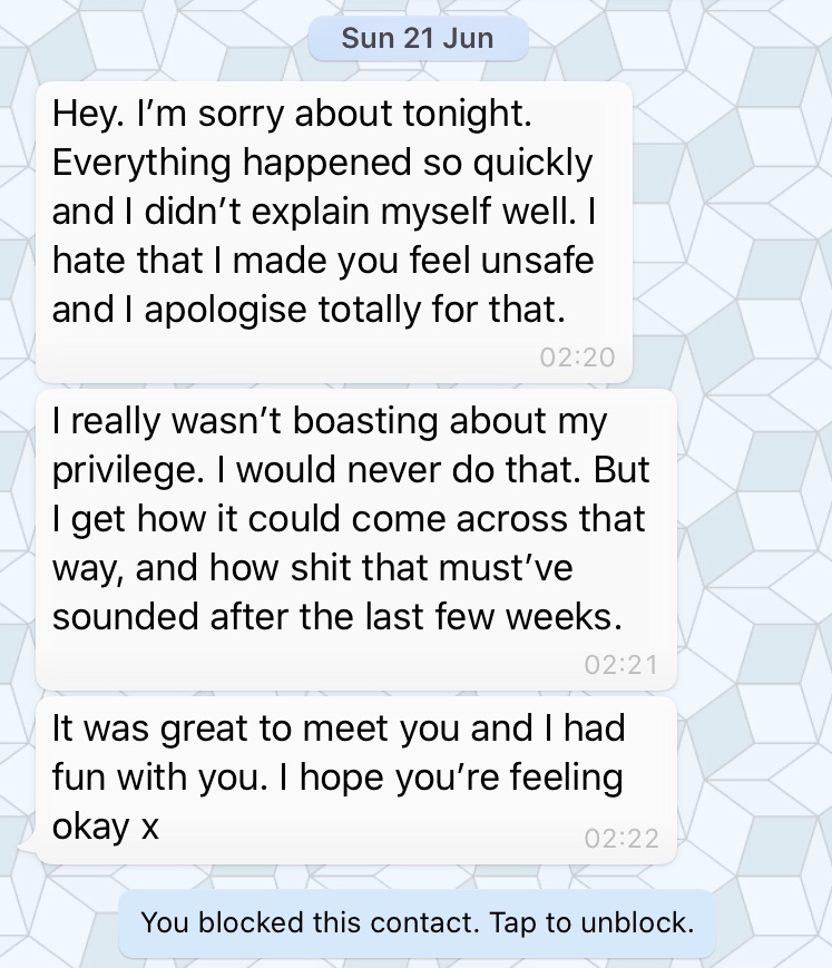 It’s only now that I realised how threatened I felt in that situation, so regardless of whether you think he’s done anything wrong in this story, I still had a tall, large man in my house when I was alone and also drunk (he saw me almost finish a bottle of wine in front of him) aggressively arguing with me and making me cry – instead of realising he’s fucked up, he just doubled down. He’s is not the exception though, I’ve had so many interactions throughout my life where anger and denial is the normal reaction from people like him. And this is why I have trouble trusting men, especially white men.